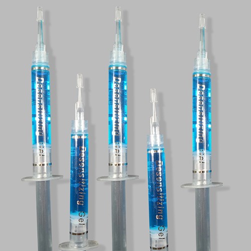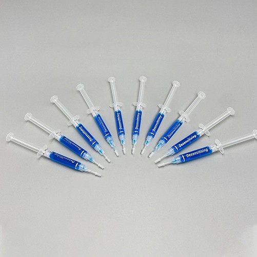 5.Use even densensitizing syringe to apply a tin layer of gel to each tooth , don't apply gel to the gums.