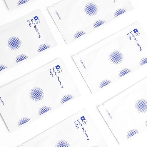 Line the whitening strip along the gumline, adhering sticky side todry teeth, and apply gentle pressure to secure the strip.